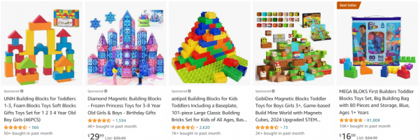 积木玩法多样,既能益智又能提高手眼协调能力,是十分受欢迎的玩具产品。亚马逊上在售相关listing多达20000+,其中月销过千留评破万的产品不在少数。